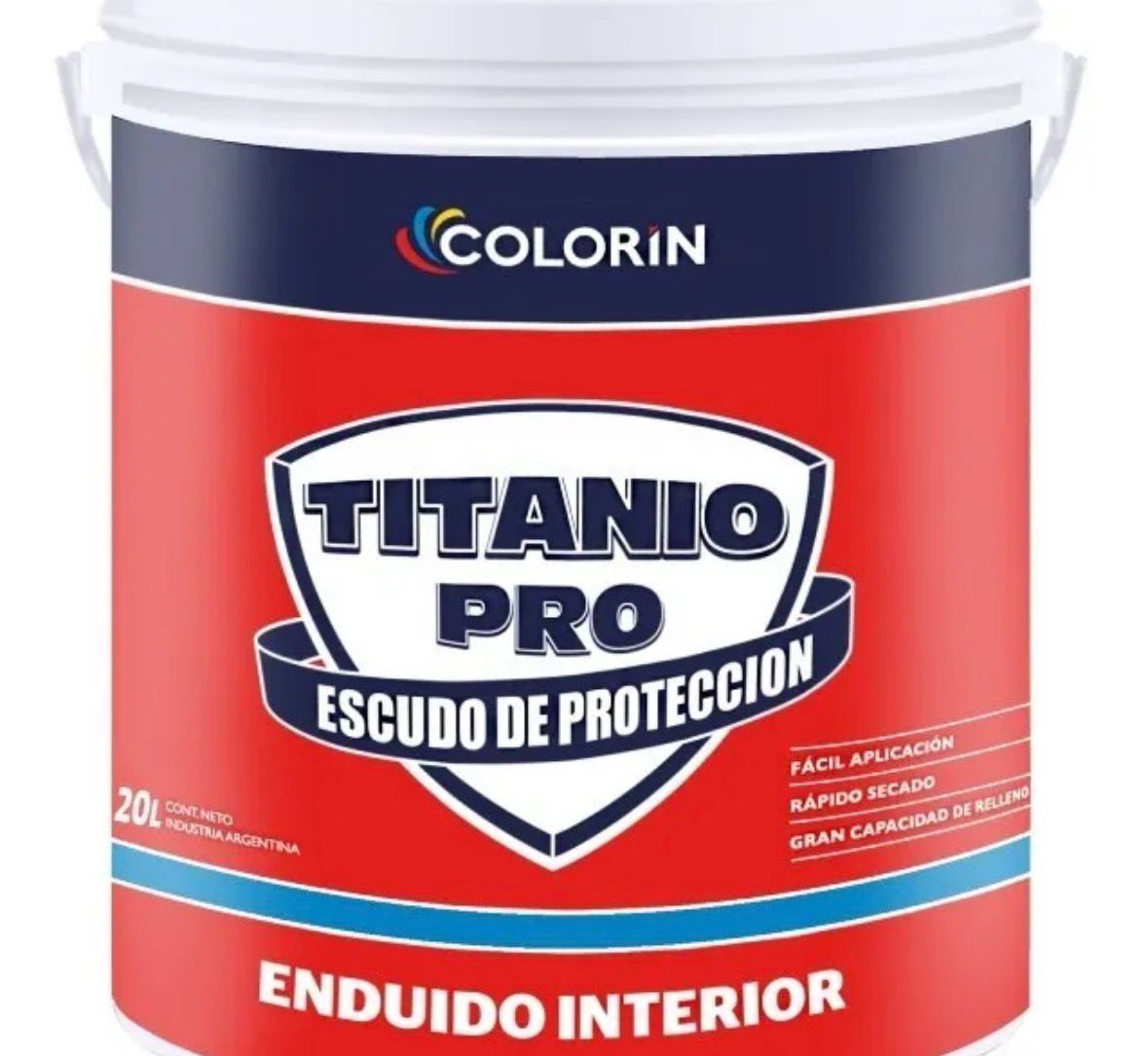 Enduido Titanio Pro interior de Colorín por 20 litros, ideal para obras o trabajos grandes donde se requiere reparar y alisar amplias superficies. Brinda gran capacidad de relleno, secado rápido y fácil lijado, permitiendo obtener paredes lisas y listas para la aplicación de pintura.