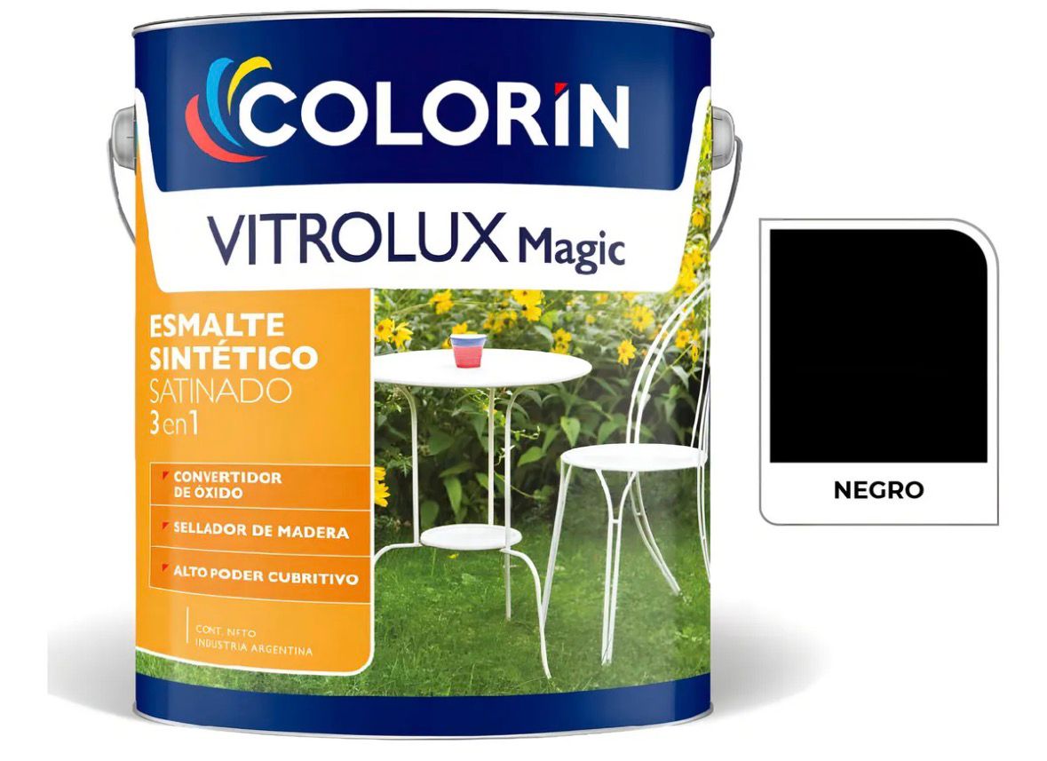 Esmalte sintético Vitrolux Triple Acción negro satinado de 1/2 litro, ideal para proteger y decorar superficies de metal y madera. Su fórmula 3 en 1 actúa como convertidor de óxido, sellador y esmalte, permitiendo aplicar directamente sin fondo previo. Ofrece buen poder cubritivo, excelente adherencia y terminación satinada uniforme. Aplicación con pincel, rodillo o soplete.
