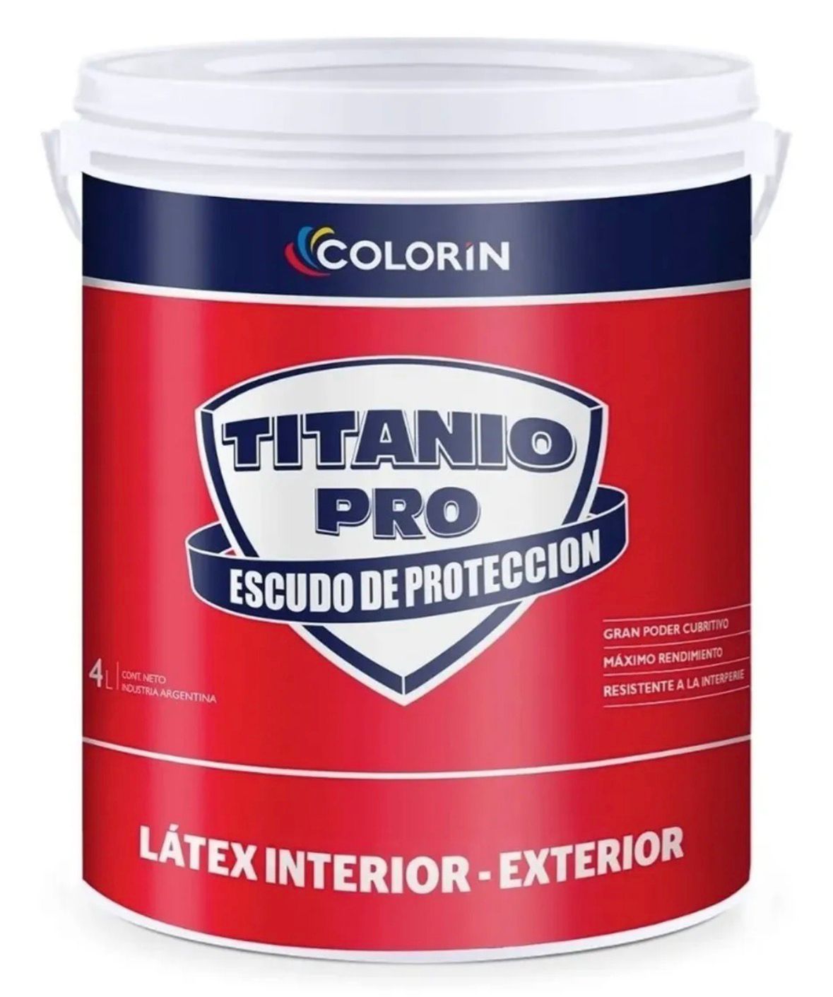 Pintura látex Titanio Pro exterior–interior de Colorín por 10 litros, formulada para brindar protección y decoración en superficies de mampostería, revoque, hormigón y yeso. Se destaca por su buen rendimiento, fácil aplicación y acabado uniforme, ideal para trabajos de pintura en hogar u obra.