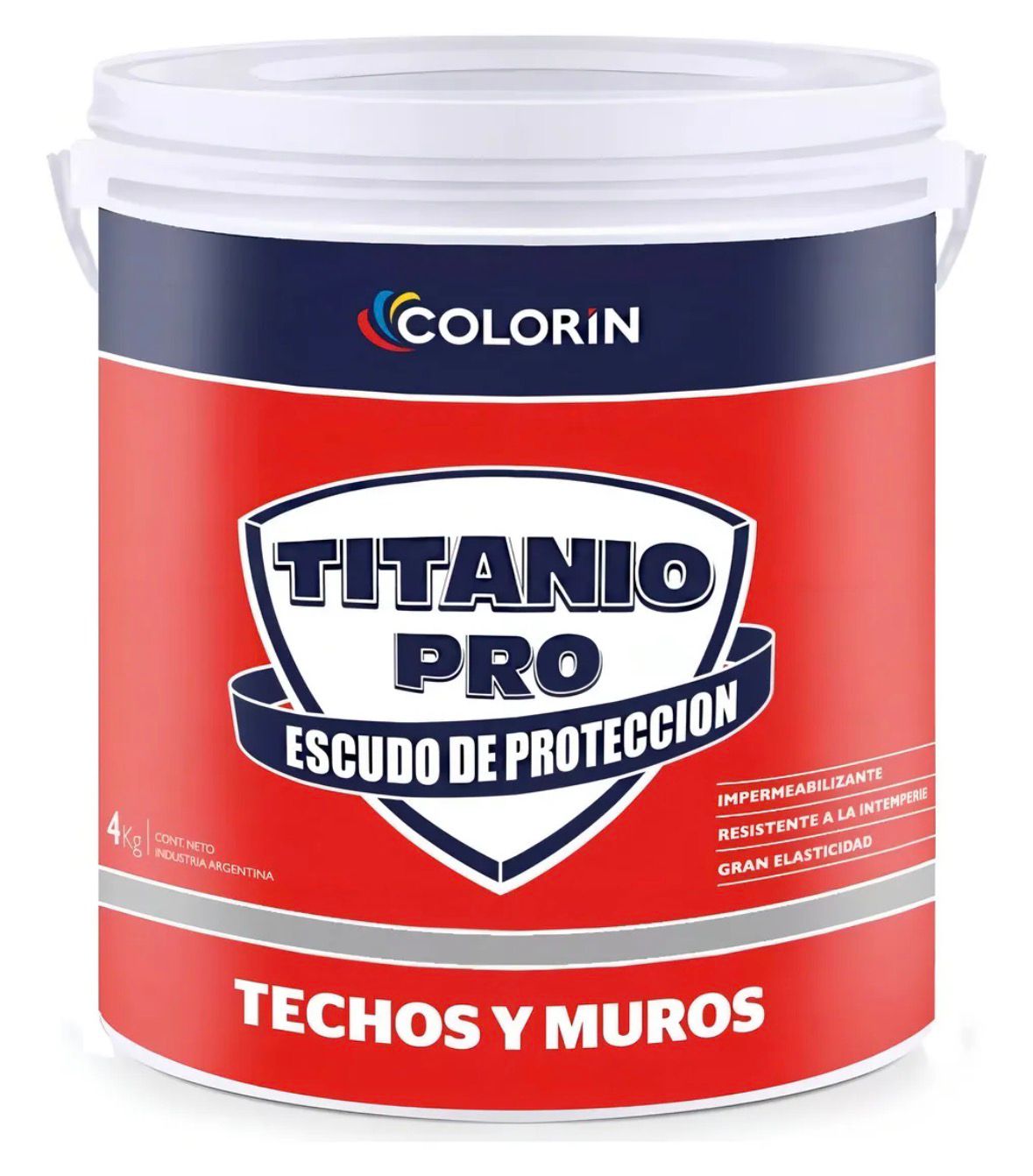Membrana líquida Titanio Pro Techo de Colorín por 4 litros, ideal para impermeabilizar y proteger techos y terrazas. Forma una película elástica y resistente que ayuda a prevenir filtraciones y soporta las condiciones climáticas. Ofrece buena adherencia sobre diferentes superficies y está disponible en colores rojo, verde y blanco. Aplicación con pincel, rodillo o soplete.