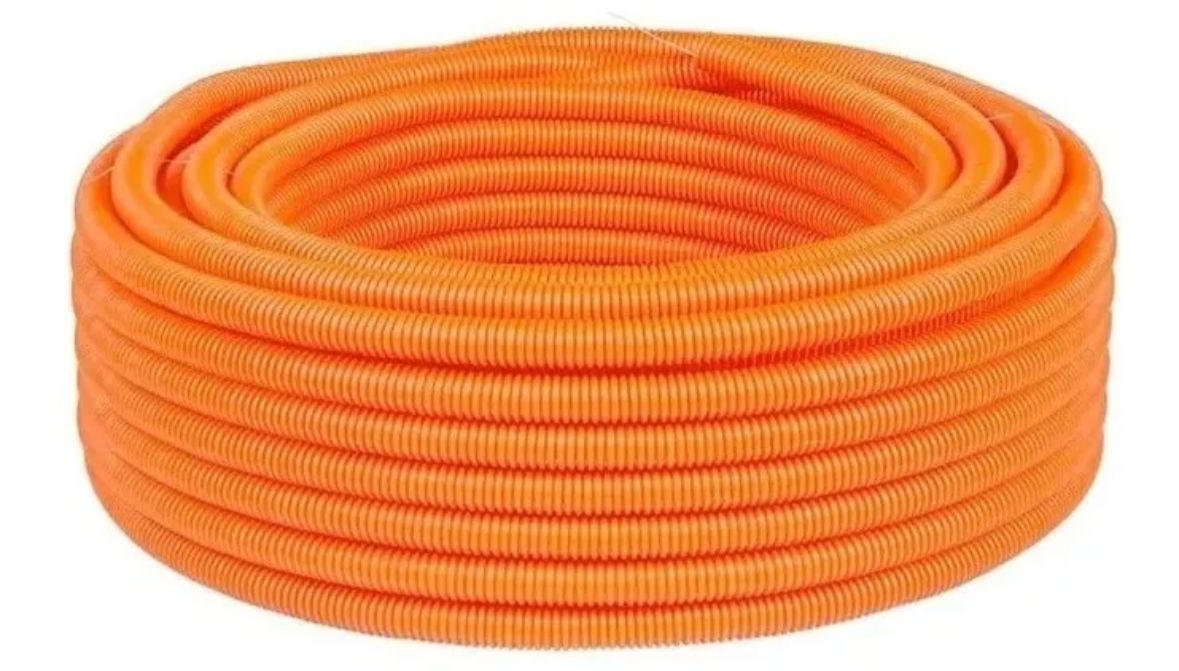 Tubo corrugado naranja de alta resistencia, ideal para la protección y canalización de cables eléctricos o de comunicaciones en instalaciones interiores y exteriores. Su flexibilidad y resistencia a la intemperie lo hacen ideal para diversas aplicaciones.