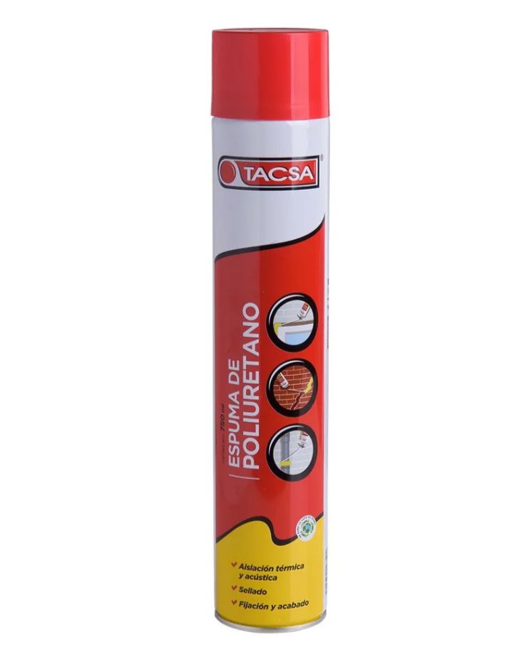 Espuma de PU TACSA es una espuma de poliuretano expansible monocomponente y endurecimiento por humedad. Es ideal para proyectos de montaje y construcción y se recomienda para fijar, sellar y aislar. Posee resistencia a la intemperie, pero es necesario proteger la espuma de los rayos UV (pintar en caso que quede expuesta). Posee resistencia a los vapores de agua, pero si se somete a humedad continua, es necesario proteger la espuma con pintura. No se adhiere en Teflón™, silicona, PP (polipropileno) y PE (polietileno).