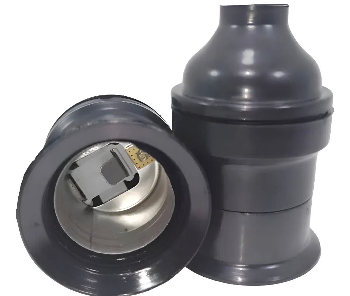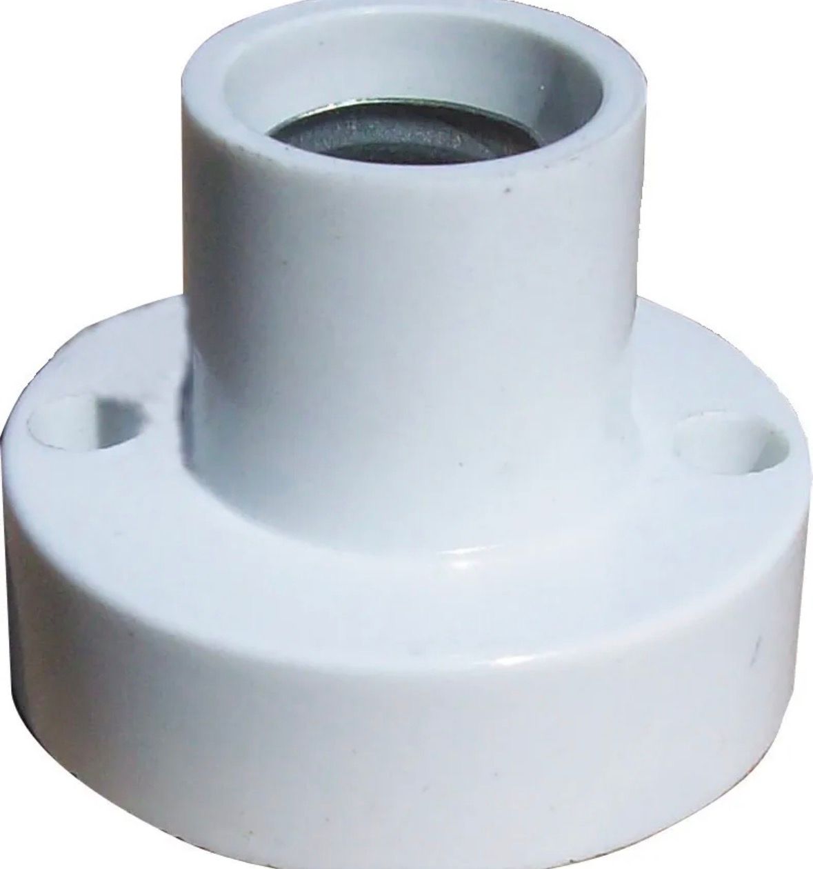 Portalámpara de 3 piezas, compuesto por base, aro y tapa. Ideal para instalaciones eléctricas en techos o paredes, permitiendo una conexión segura y práctica de la lámpara.